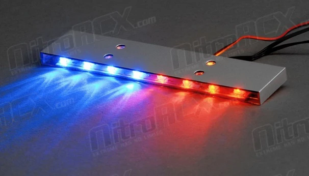 This LED light bar is the perfect addition to your law enforcement or emergency scale vehicle. The dimensions are sized to fit perfectly on a 1/10 scale body. It features 16 total LED mounted on a chip board controlled by 2 momentary switches. One switch controls the 4 red and 4 blue LED on the front panel, while the other switch controls the 8 amber LED on the rear. The switches also provide the choice of 9 different flash modes allowing different strobing patterns and effects. This bar will be the perfect finish on any RC or scale model.