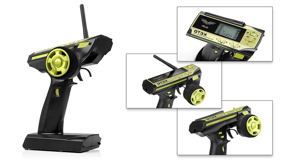 Introducing the new Dimension GT3X AFHDS 2.4ghz 3 Channel radio system. This sleek radio system features excellent ergonomics and design. The Transmitter uses proven channel hopping technology to provide reliable link for RC Cars & Boats. The Dimension GT3X features a Back-lit LCD, quick access wheel for function selection and programming. The radio has an abundance of features and settings such as 10 Model memory, a host of programming features and compatibility with the proven FS-A3 3 Channel receiver. The steering wheel has great response with the perfect amount of resistance and spring back to center perfectly. The foam grip around the wheel will ensure your fingers do not slip if they are covered in dirt or oil. The combination of features and reliability means the Dimension GT3X could be the last radio you will ever need to get!