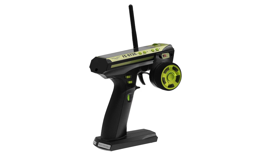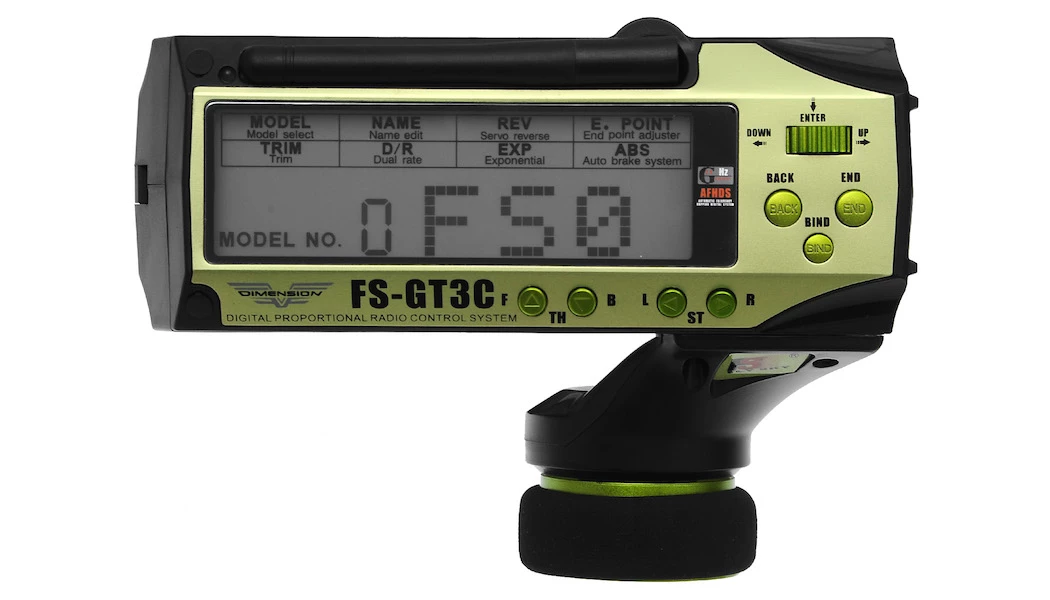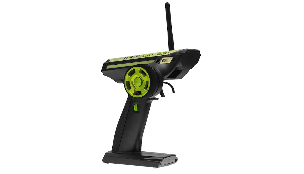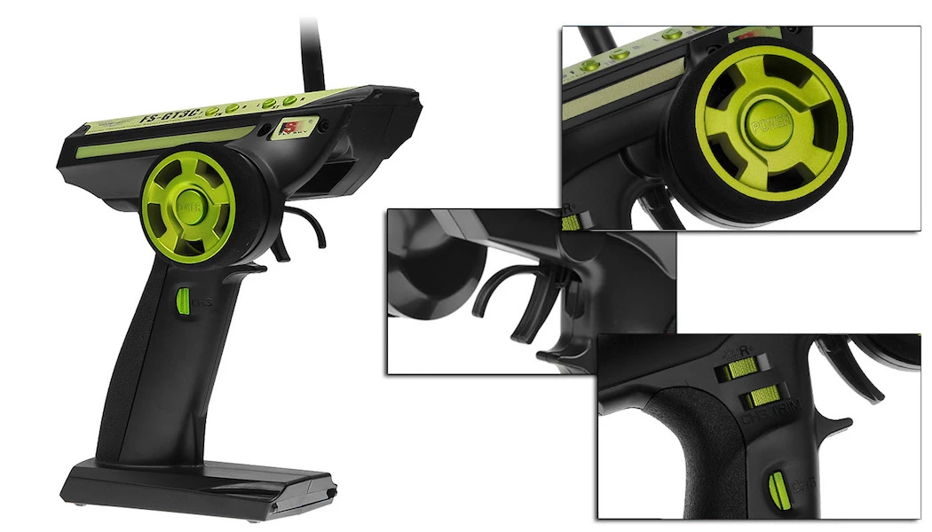 The all new Fly Sky GT3C 2.4ghz transmitter is equipped with loads of new features. New and improved power system features a 3.7v Lithium Polymer battery for longer run times and gives the user savings on purchases of AA batteries. Well all know those AA batteries drain out way too fast! A feature we really like is the scroll/select button for quicker selection of the menus and settings. The large LCD screen is easy to read and allows the user to quickly set parameters. The Dual Rate button is set right near the thumb to allow for quick adjustments without taking your eyes off of the vehicle your driving. The larger font for trims are also easier to read. The LCD screen has a white backlight screen instead of the blue found on the GT3B which we found is easier on the eyes. The GT3C comes with 2 different rubber grips that allow fine tuning for hand comfort and will suit a variety of hand sizes. The foam on the steering wheel has a very comfortable grippy feel. The GT3C only weighs 330grams with the battery which is extremely light and handy. The entire package comes ready to go with charger cable included.