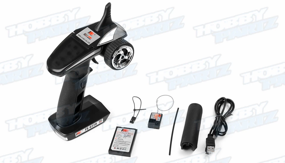 Fly Sky introduces its newest 3 channel radio system. This sleek radio system features improved ergonomics and design. The Radio is powered by a 800mah 3.7v lithium battery for enhanced runtime and lighter weight. No more searching for AA batteries the lipo is ready to charge up at any usb port. The 3 channel GR3F receiver features channels 1 and 2 for proportional throttle and steering controls, while the 3rd channel is a push button on and off type of switch located conveniently on the pistol grip. The transmitter is setup for right handed use and allows quick changes to the steering and throttle trim dials, along with steering and throttle channel reversing and very useful steering dual rate dial at the tip of your fingertips. The steering wheel has great response with the perfect amount of resistance and spring back to center perfectly. A rubber grip around the wheel ensure your fingers do not slip if they are covered in dirt or oil. The pistol grip is also interchangeable with a fatter palm swell to accommodate larger hands. This is the newest Fly Sky FS-GT2B 3 channel 2.4ghz radio and we are impressed!